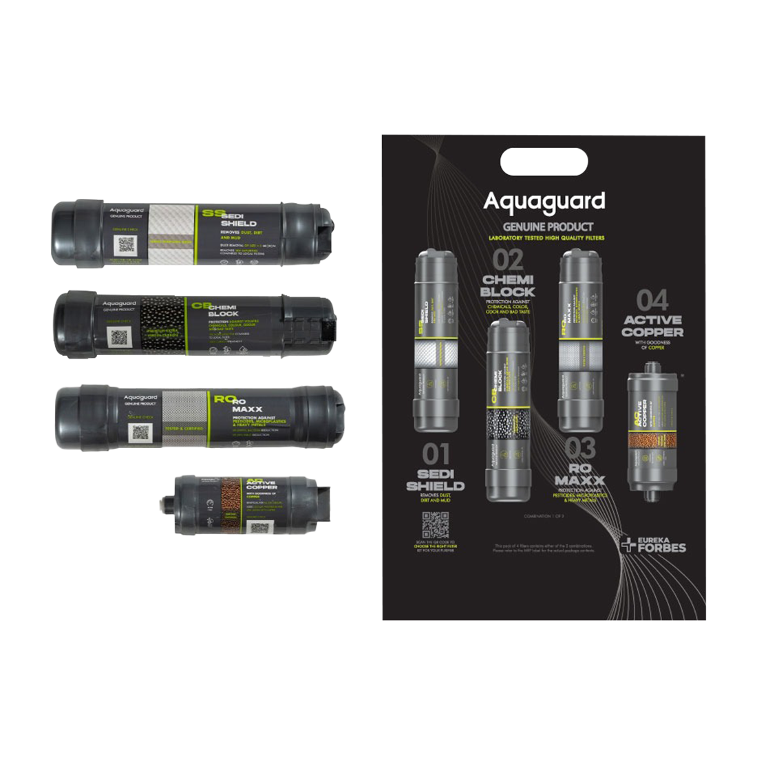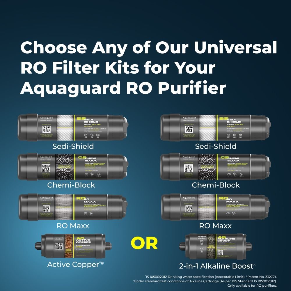 Eureka Forbes Aquaguard Astor HP2.0, Universal RO Filter Kit with Active Copper. This kit includes 4 filters: Sedi-Shield, Chemi-Block, RO Maxx, and Active Copper. Filter life: 6000L or 1 year.
