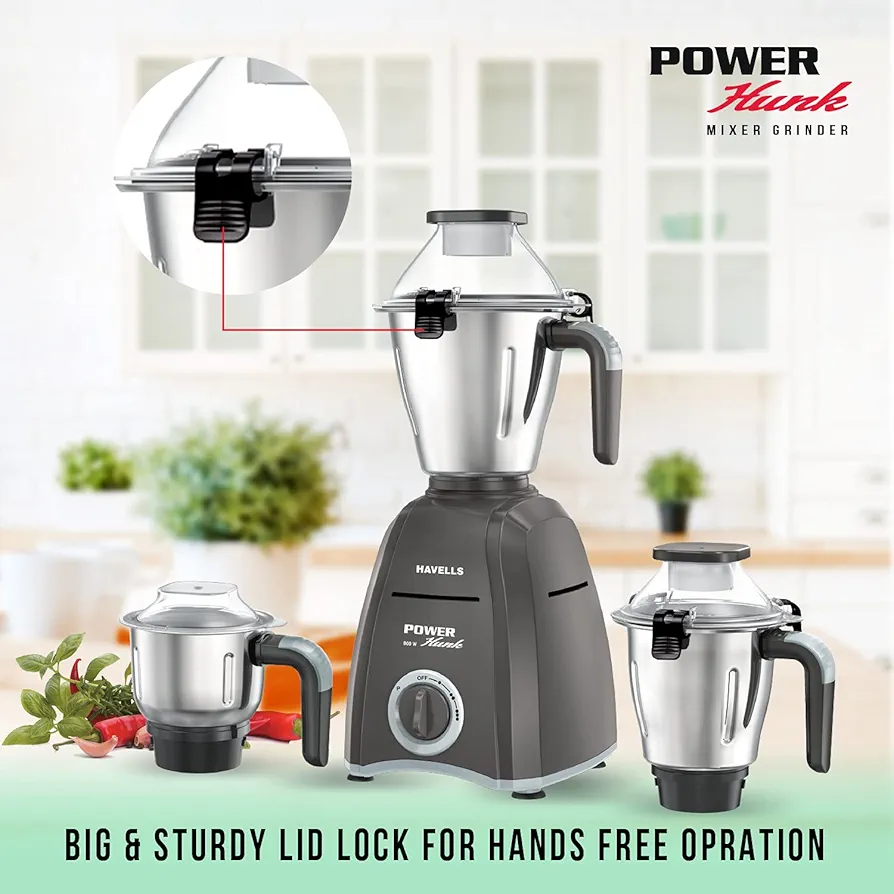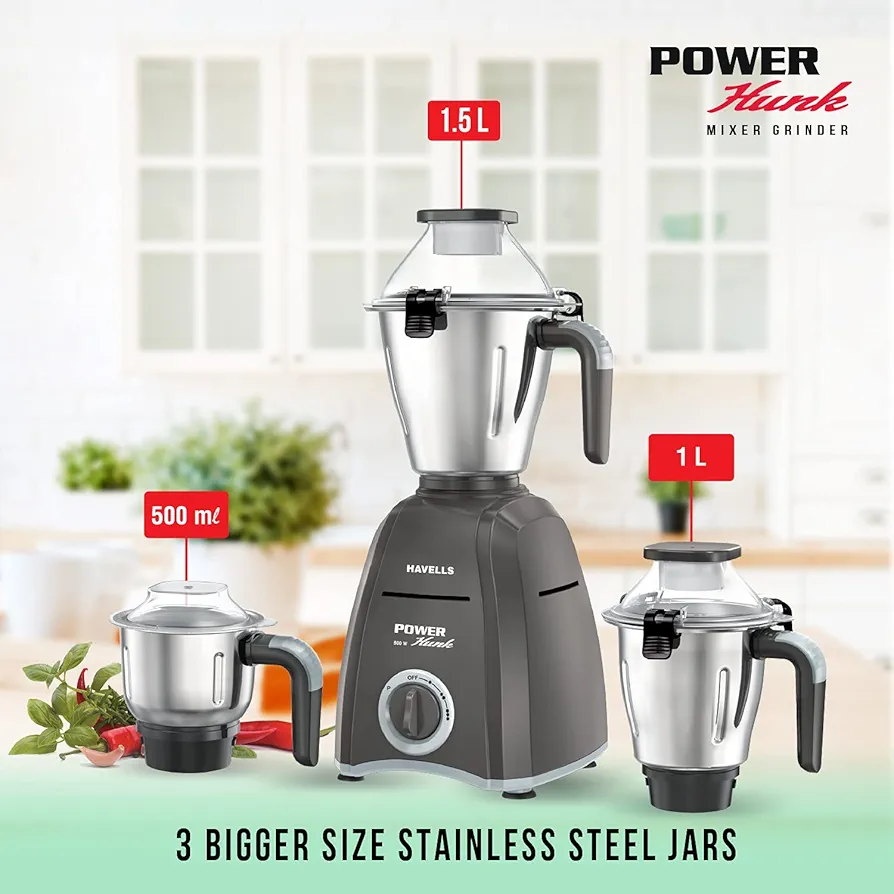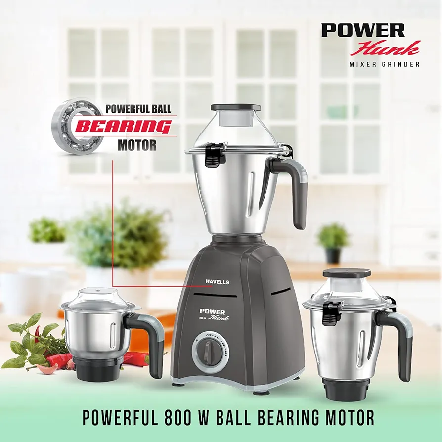 Havells Power Hunk 800Watt Mixer Grinder, 3 Stainless Steel Jar with Handles, 21000 RPM High-Speed Motor, 2-Years Product Warranty, 7-Year Motor Warranty, Heavy-Duty Mixie.