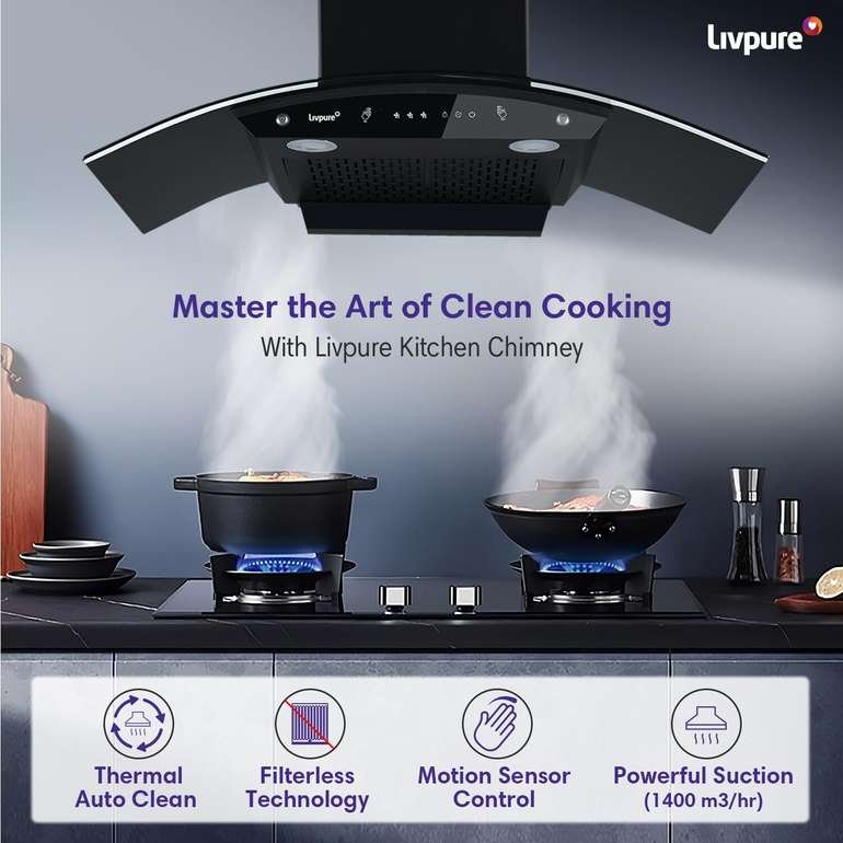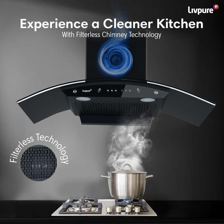 Livpure Swirl-90 Cm Powerful Suction 1400 m3/hr Curved-Shape | Filterless Auto Clean Kitchen Chimney with Oil collector, 3 Speed Touch & Motion Sensor Control, Energy Efficient Dual LED Lamp.